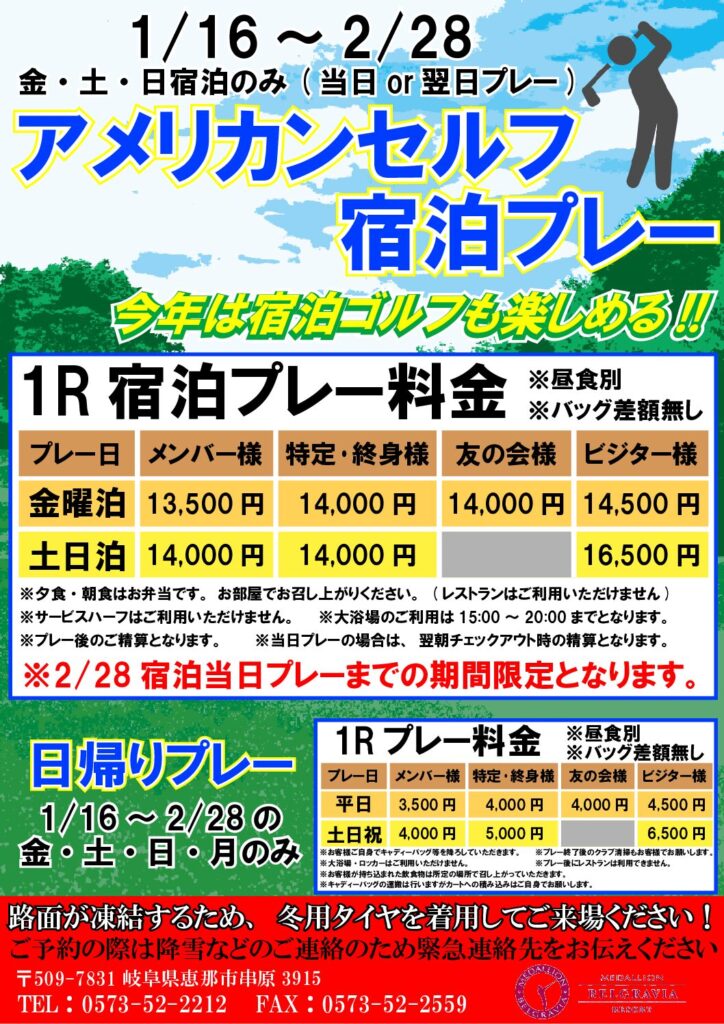【期間限定】アメリカンセルフ 宿泊プレーのご案内(1/16〜2/28) 1/16〜2/28の期間、金・土・日宿泊限定で「アメリカンセルフ 宿泊プレー」をご用意しました(当日プレー or 翌日プレー)。今年は“宿泊ゴルフ”も楽しめる内容です。あわせて、日帰りプレー...